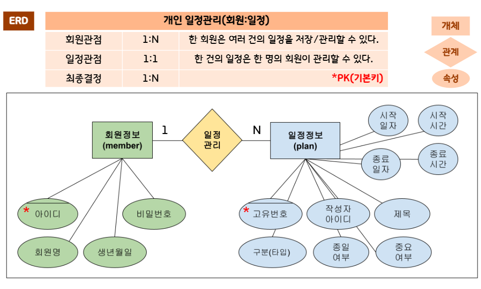 개체관계 다이어그램(ERD)이란, Entity Relationship Diagram의 약어로 각 업무 분석에서 도출된 개체 간의 관계를 이해하기 쉽게 도식화한 다이어그램을 말한다. ERD는 개체-관계(E-R) 모델을 다이어그램으로 나타낸 것인데, 여기서 개체-관계 모델이란 현실 세계에 존재하는 데이터와 그 데이터들 간의 관계를 사람이 이해할 수 있는 형태로 명확하게 표현하기 위한 모델을 의미한다. 개체-관계(E-R) 모델의 구성요소 : 개체, 속성, 관계 구성요소 설명 특징 개체(Entity) 사물, 사람 등 유무형의 정보를 가지고 있는 요소 물리적 설계 단계에서 테이블로 변환 속성(Attribute) 개체가 갖는 속성을 의미 물리적 설계 단계에서 컬럼으로 변환 관계(Relationship) 두 개 이상..