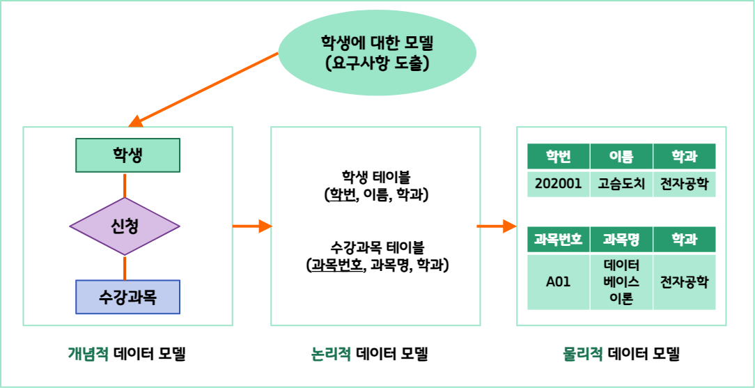 개체관계 다이어그램(ERD)이란, Entity Relationship Diagram의 약어로 각 업무 분석에서 도출된 개체 간의 관계를 이해하기 쉽게 도식화한 다이어그램을 말한다. ERD는 개체-관계(E-R) 모델을 다이어그램으로 나타낸 것인데, 여기서 개체-관계 모델이란 현실 세계에 존재하는 데이터와 그 데이터들 간의 관계를 사람이 이해할 수 있는 형태로 명확하게 표현하기 위한 모델을 의미한다. 개체-관계(E-R) 모델의 구성요소 : 개체, 속성, 관계 구성요소 설명 특징 개체(Entity) 사물, 사람 등 유무형의 정보를 가지고 있는 요소 물리적 설계 단계에서 테이블로 변환 속성(Attribute) 개체가 갖는 속성을 의미 물리적 설계 단계에서 컬럼으로 변환 관계(Relationship) 두 개 이상..